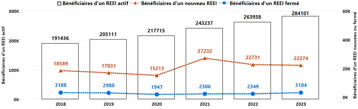- Figure 1 : Nombre annuel de bénéficiaires d'un REEI actif, nouveau et fermé de 2018 à 2023