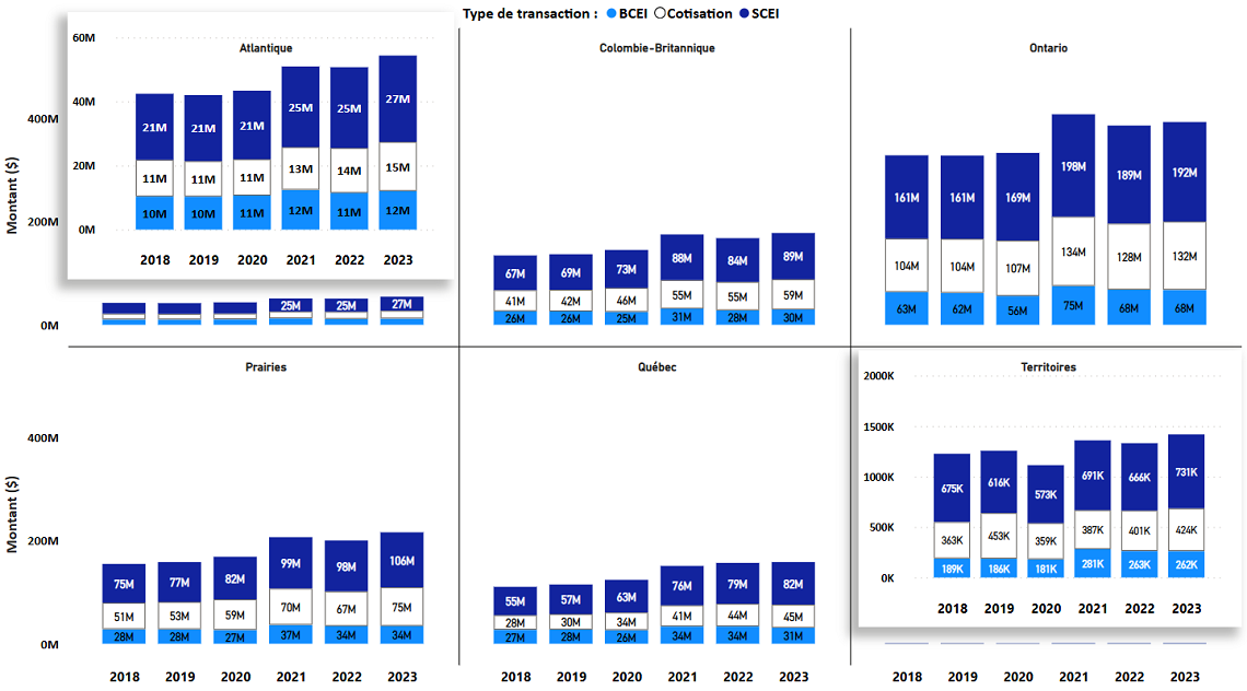- Figure 11 : Montant annuel total ($) des cotisations, de la SCEI et du BCEI selon la région, de 2018 à 2023
