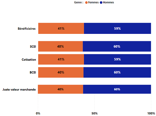 - Figure 12 : Répartition (%) selon le genre du nombre de bénéficiaires de REEI, des cotisations, de la SCEI, du BCEI et de l'actif total (juste valeur marchande) en 2023