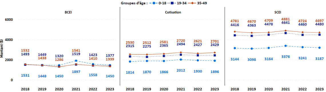 - Figure 15 : Moyenne annuelle ($) des cotisations, de la SCEI et du BCEI selon le groupe d'âge, de 2018 à 2023