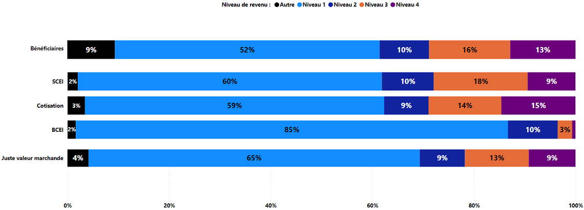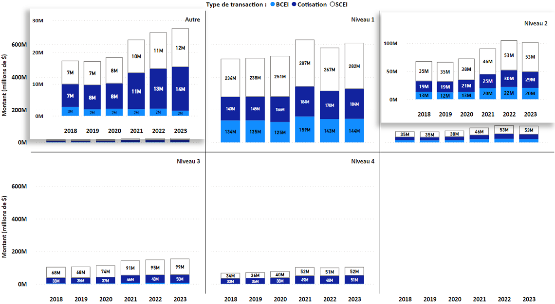 La figure 17 montre les montants totaux des cotisations, de la SCEI et du BCEI selon le niveau de revenu des bénéficiaires de 2018 à 2023, ainsi que des vues agrandies du « niveau 2 » et de la catégorie « autre ». Malgré des fluctuations mineures, tous les niveaux de revenu affichent une croissance. Le niveau 1 montre systématiquement les totaux les plus élevés, ce qui met en évidence une participation et un soutien accrus pour les personnes à revenu faible ou modeste.