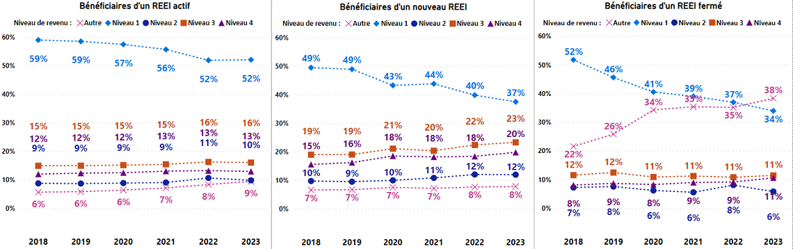 - Figure 6 : Répartition (%) selon les niveaux de revenu des bénéficiaires d'un REEI actif, nouveau et fermé de 2018 à 2023