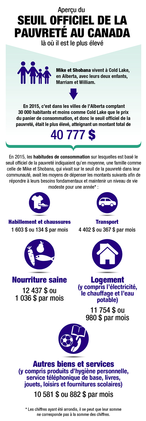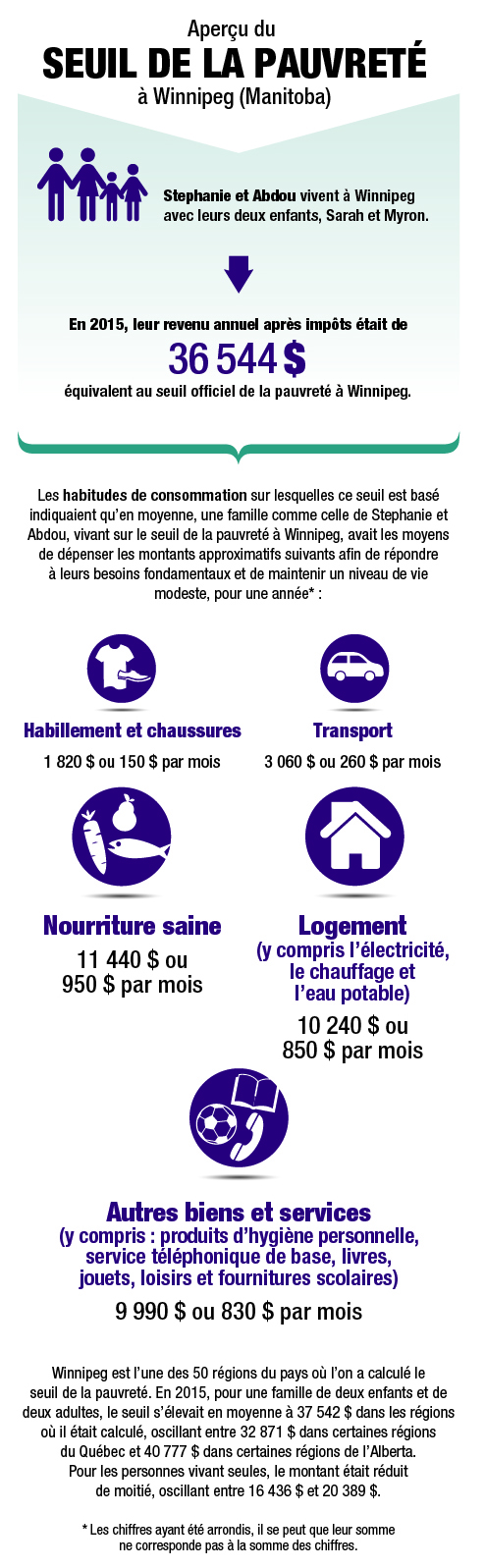 Stephanie et Abdou vivent à Winnipeg avec leurs deux enfants, Sarah et Myron. En 2015, leur revenu annuel après impôts était de 36 544 $, équivalent au seuil officiel de la pauvreté à Winnipeg. Les habitudes de consommation sur lesquelles ce seuil est basé indiquaient qu'en moyenne, une famille comme celle de Stephanie et Abdou, vivant sur le seuil de la pauvreté à Winnipeg, avait les moyens de dépenser les montants approximatifs suivants afin de répondre à leurs besoins fondamentaux et de maintenir un niveau de vie modeste, pour une année :