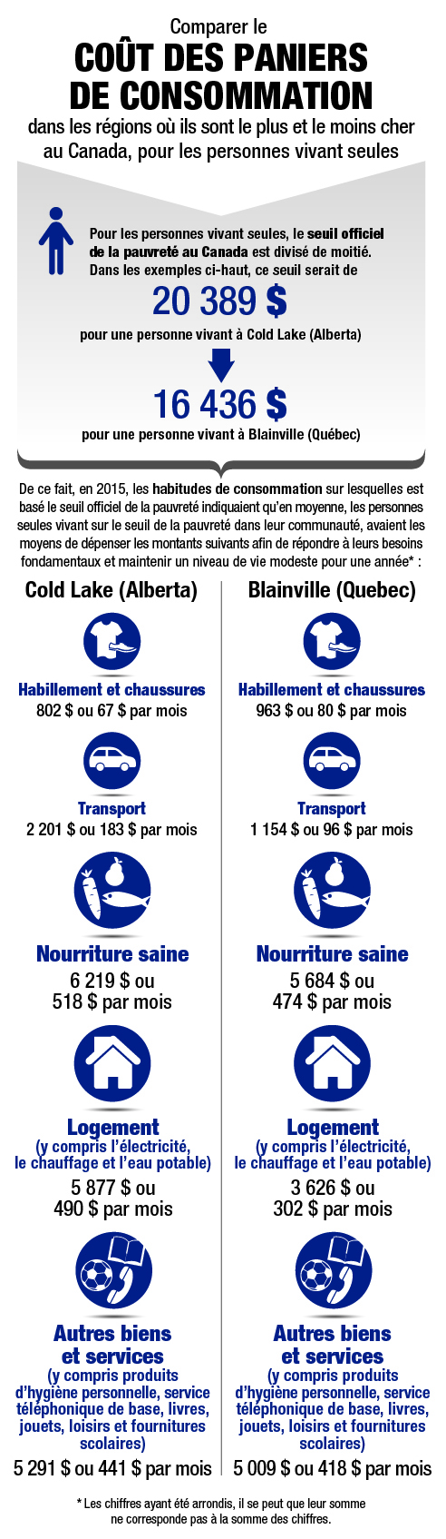 Le coût de chacun des éléments du panier est directement lié à leur prix dans les communautés canadiennes. Le seuil officiel de la pauvreté au Canada reflète les seuils dans 50 régions du pays, notamment dans 19 communautés précises. Où qu'elles vivent au pays, si les personnes vivant seules et les familles n'ont pas les moyens d'acheter le panier de consommation dans leur communauté, on considère alors qu'elles vivent sous le seuil de la pauvreté – et donc, qu'elles vivent dans la pauvreté. Statistique Canada mettra régulièrement à jour le panier afin qu'il corresponde à ce qui est nécessaire pour prendre part à la société, aujourd'hui et demain.