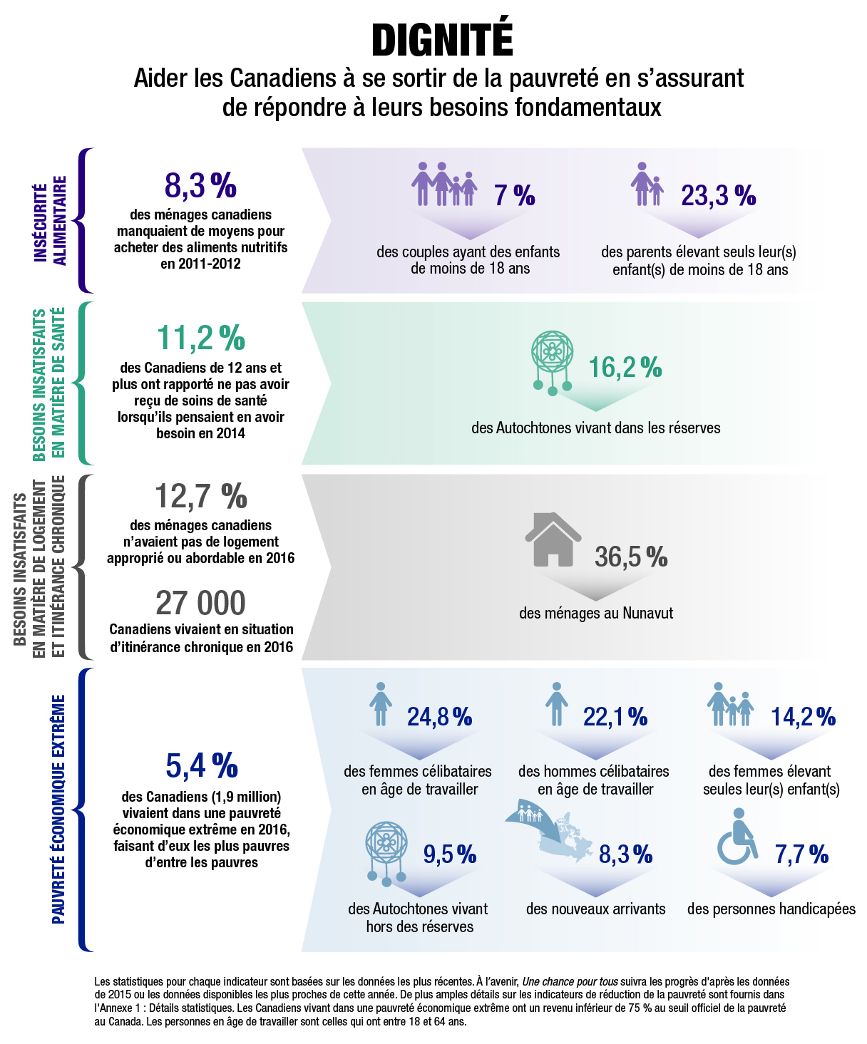- La dignité : Aider les Canadiens à sortir de la pauvreté en s'assurant de répondre à leurs besoins fondamentaux.