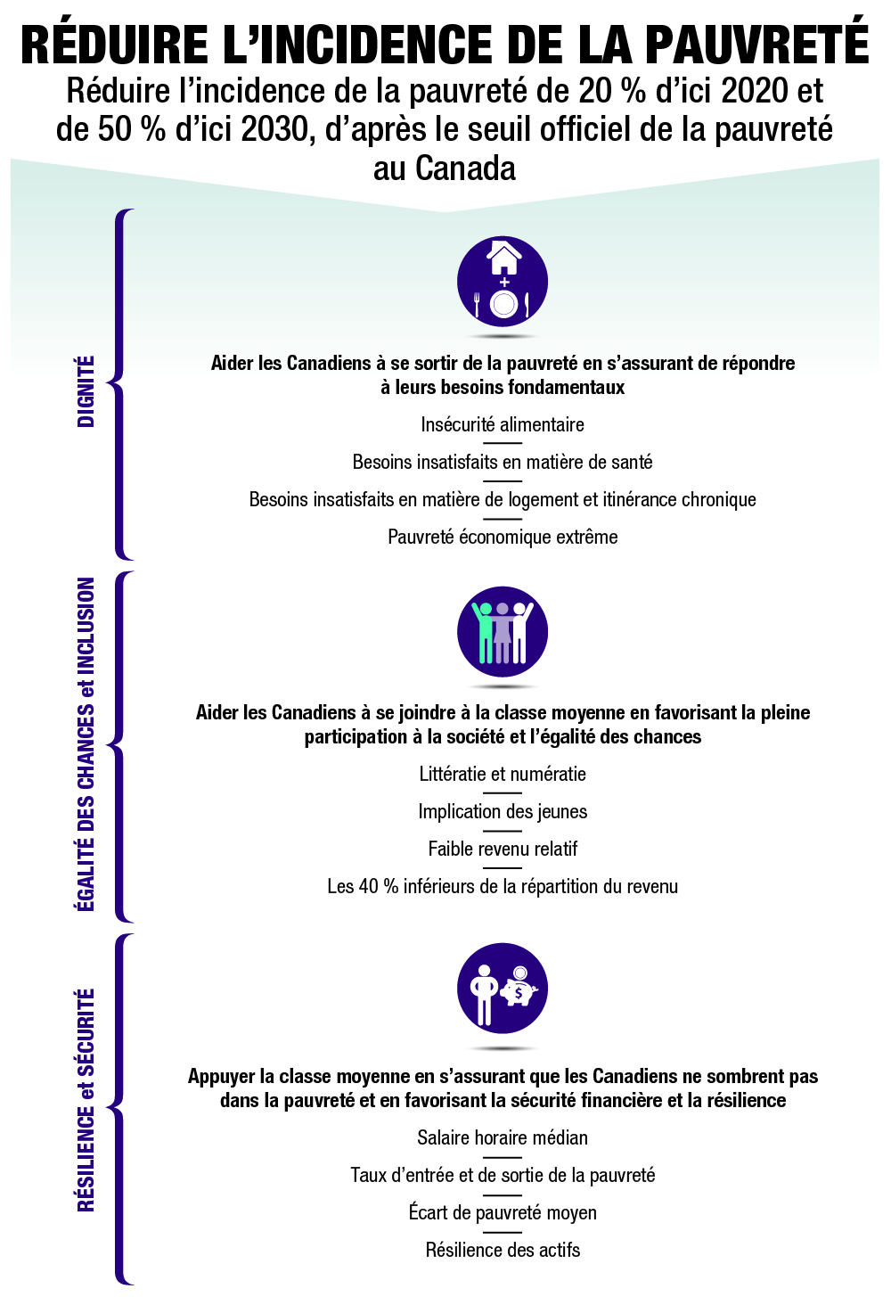Cet autre aspect d'une stratégie figure dans ce document. En effet, sachant que la pauvreté dépasse la question financière, nous définissons pour la première fois une mesure officielle de la pauvreté, établissons des cibles et des échéanciers précis visant à réduire le nombre de Canadiens vivant dans la pauvreté et présentons trois catégories d'indicateurs complémentaires.