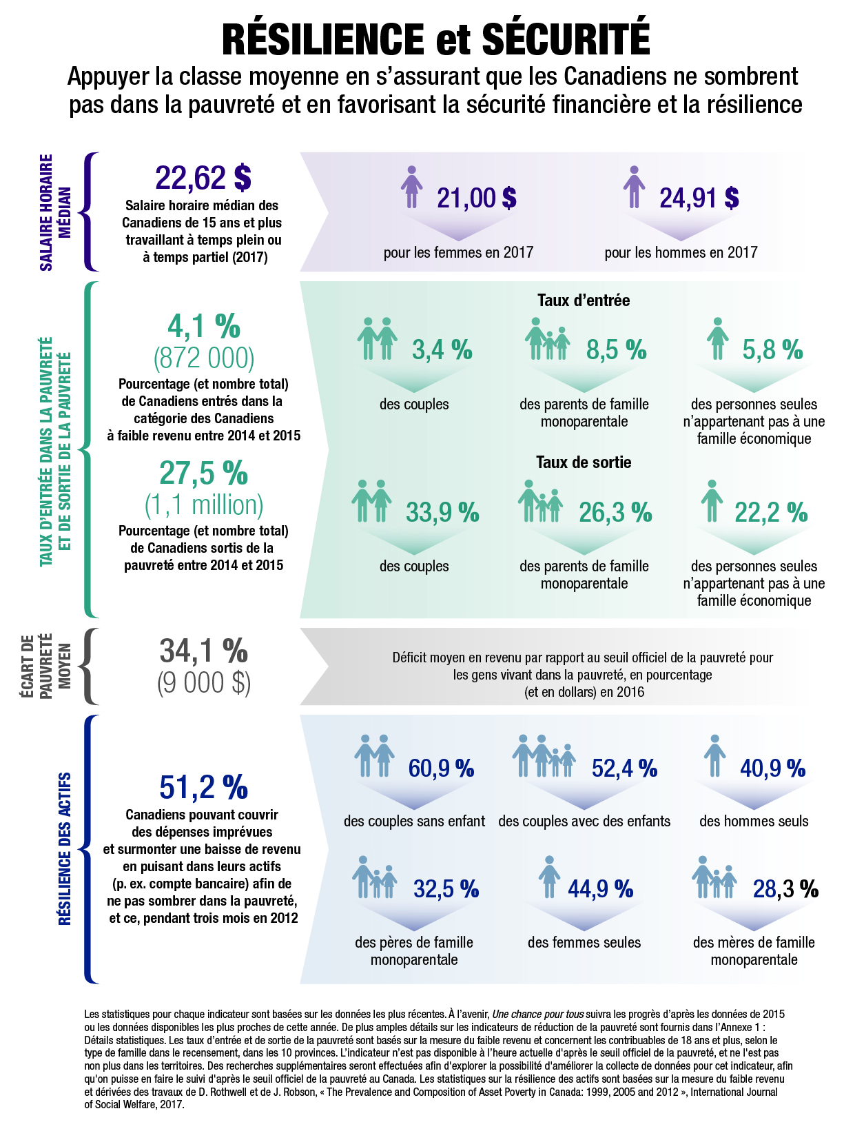 D'un point de vue global, Une chance pour tous réunit les investissements réalisés par le gouvernement depuis 2015, totalisant 22 milliards de dollars, afin d'appuyer le bien-être social et économique des Canadiens. D'ici 2019, ces mesures auront permis d'aider 650 000 Canadiens à sortir de la pauvreté, et elles continueront à porter leurs fruits dans les années à venir.