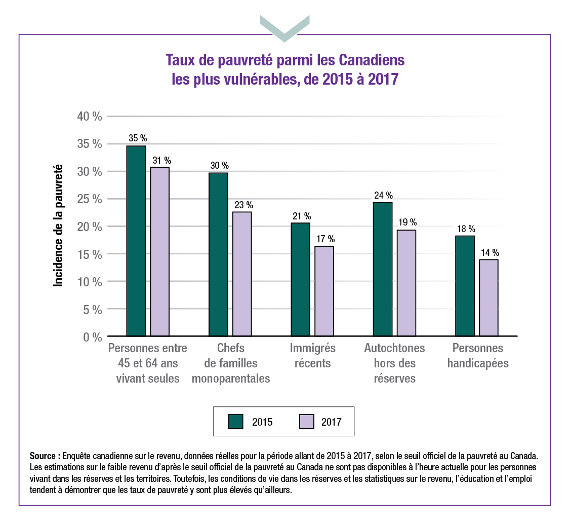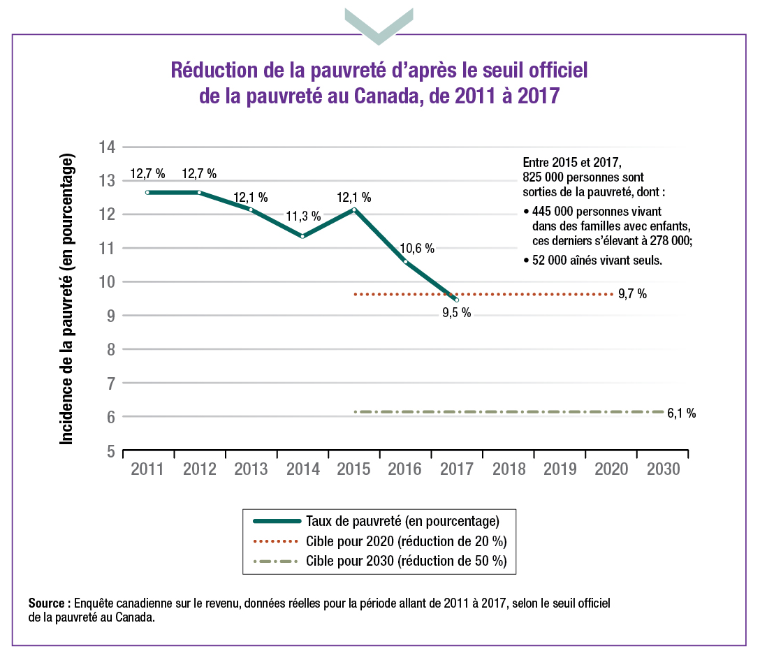 Selon l’Enquête canadienne sur le revenu de Statistique Canada, 3,4 millions de personnes, soit 9,5 % de la population, vivaient dans la pauvreté en 2017, ce qui représente une baisse du taux de pauvreté de 20 %, comparativement aux données de 2015. Cela signifie qu’entre 2015 et 2017, près de 825 000 Canadiens sont sortis de la pauvreté.