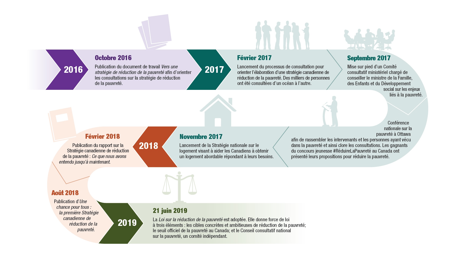 - 21 juin 2019 : La Loi sur la réduction de la pauvreté est adoptée. Elle donne force de loi à trois éléments : les cibles concrètes et ambitieuses de réduction de la pauvreté; le seuil officiel de la pauvreté au Canada; et le Conseil consultatif national sur la pauvreté, un comité indépendant.