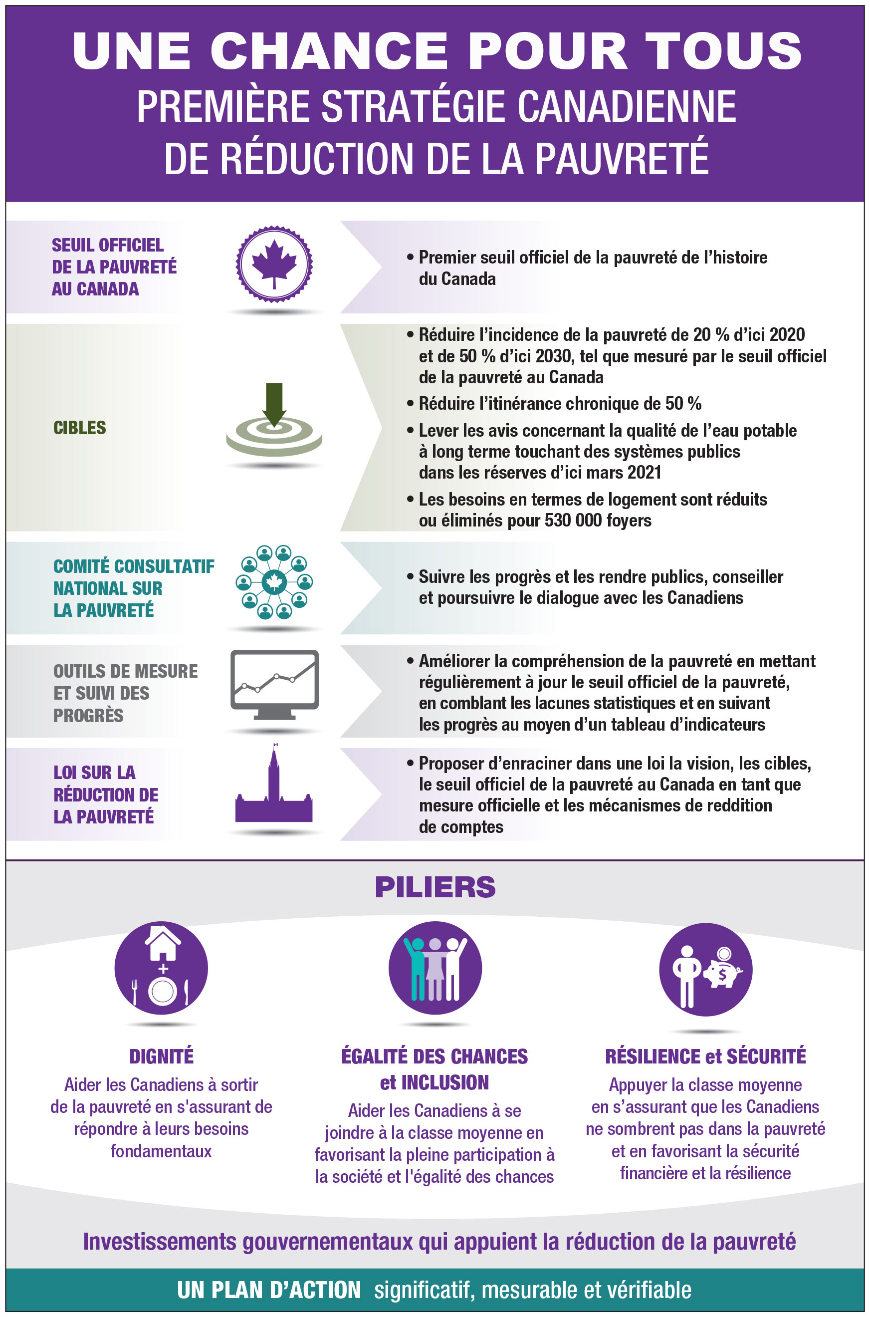 Une chance pour tous constitue un engagement à long terme visant à orienter les mesures et les investissements du gouvernement du Canada, notamment l’établissement du tout premier seuil officiel de la pauvreté au Canada, de cibles concrètes de réduction de la pauvreté, d’un plan de données et de mesure pour combler les lacunes statistiques et suivre les progrès sur la réduction de la pauvreté, d’un Conseil consultatif national sur la pauvreté et d’une loi sur la réduction de la pauvreté.