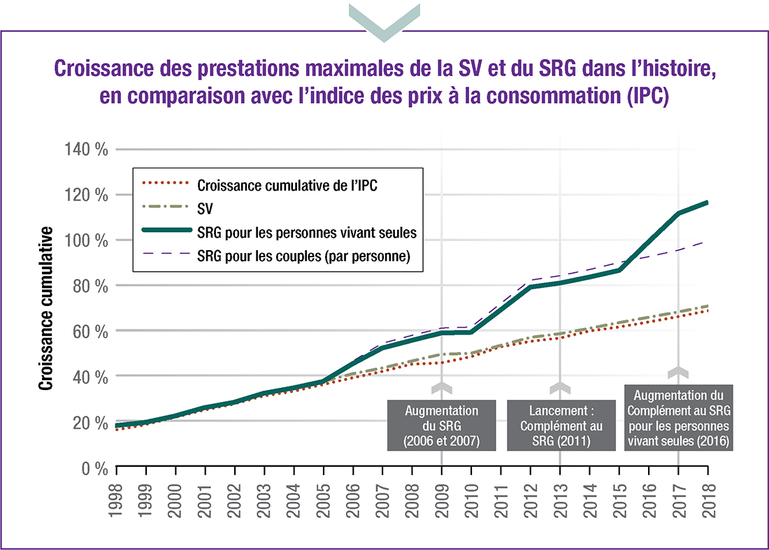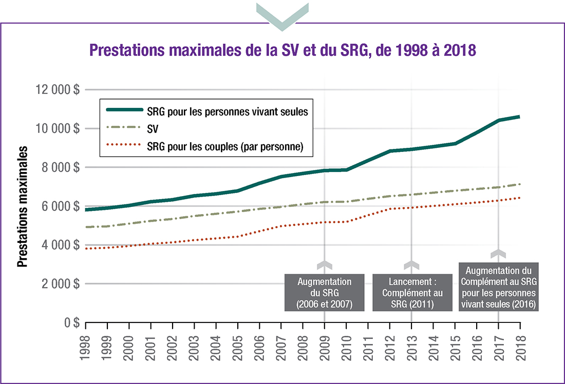 L’augmentation de la prestation complémentaire au Supplément de revenu garanti était destinée aux aînés vivant seuls. Entre 2015 et 2017, 52 000 d’entre eux ont cessé de vivre sous le seuil officiel de la pauvreté au Canada. Le revenu médian après impôt des familles d’aînés (où celui qui gagne le revenu le plus élevé a au moins 65 ans) s’élevait à 61 200 $ en 2017, une hausse de 2 000 $ comparativement aux données de 2015.