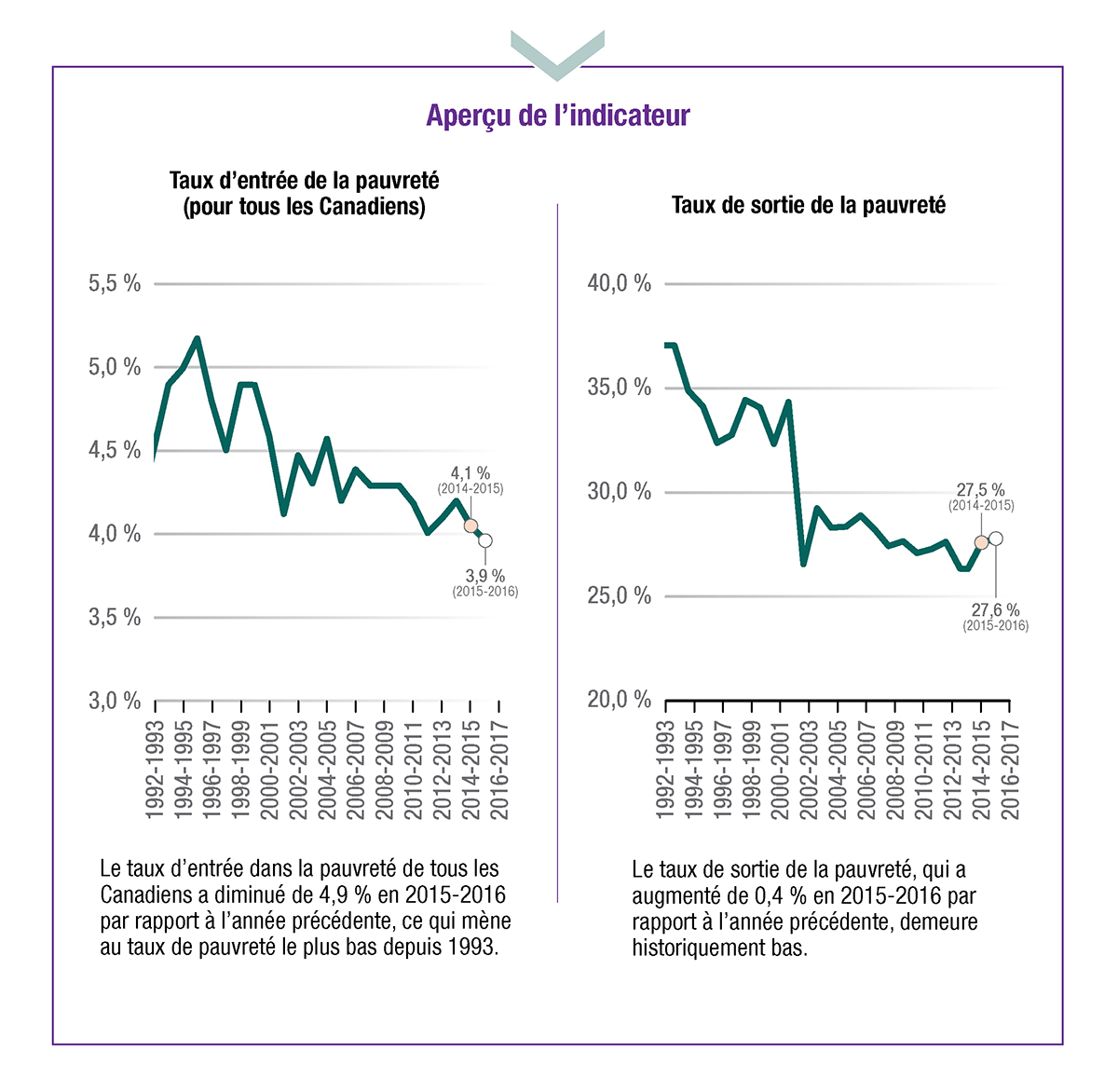 Le taux d’entrée dans la pauvreté de tous les Canadiens a diminué de 4,9 % en 2015-2016 par rapport à l’année précédente, ce qui mène au taux de pauvreté le plus bas depuis 1993.