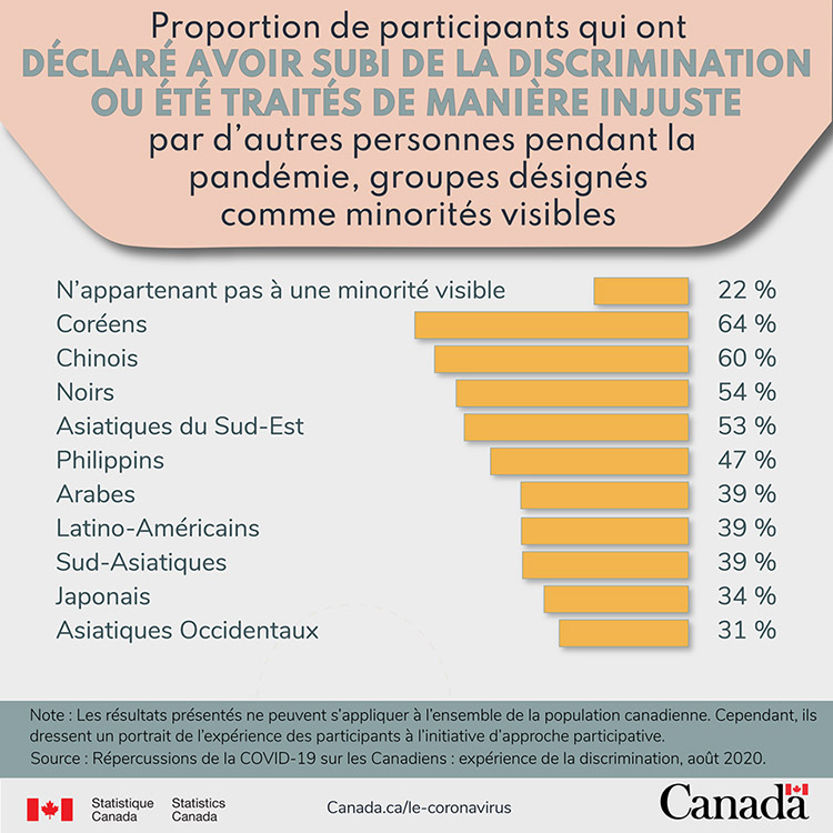 Bien qu’on ne puisse appliquer ces résultats à l’ensemble de la population, plus du quart des participants ont déclaré avoir subi de la discrimination ou avoir été traités injustement durant la pandémie. Pour voir tous les résultats, consultez l’article de Statistique Canada intitulé : Expérience de la discrimination pendant la pandémie de COVID-19.