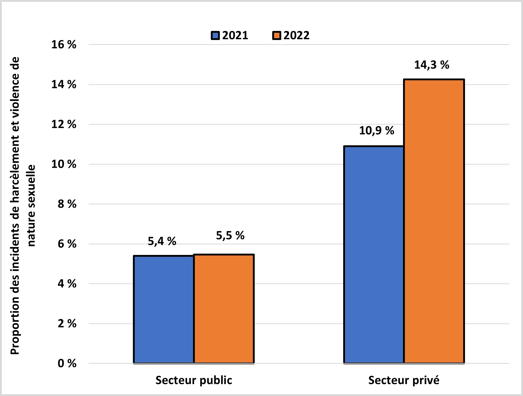 - Graphique 2 : Proportion des incidents de harcèlement et de violence de nature sexuelle signalés dans le secteur public par rapport au secteur privé en 2021 et 2022