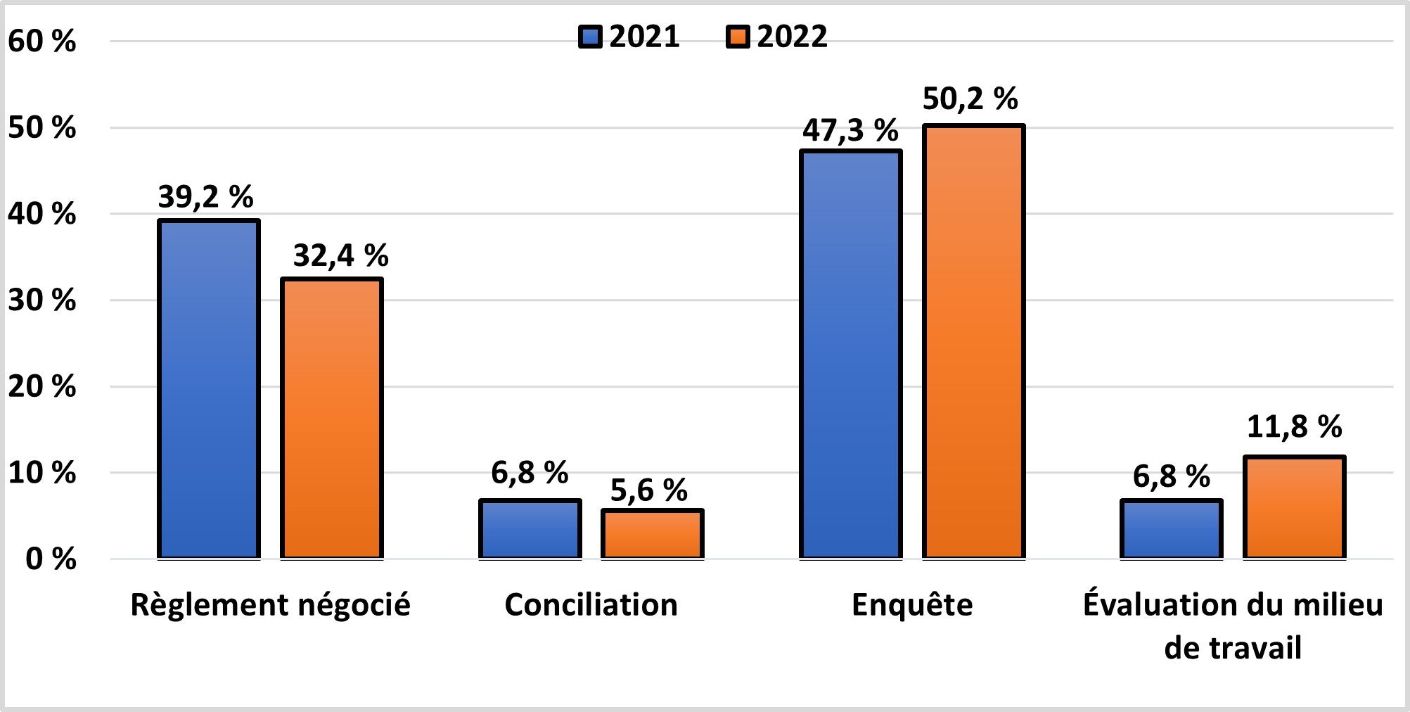 - La méthode la plus fréquemment utilisée pour régler les incidents de harcèlement et de violence en 2021 et 2022 a été l'enquête, représentant environ 50 % de toutes les résolutions déclarées au cours des 2 années.