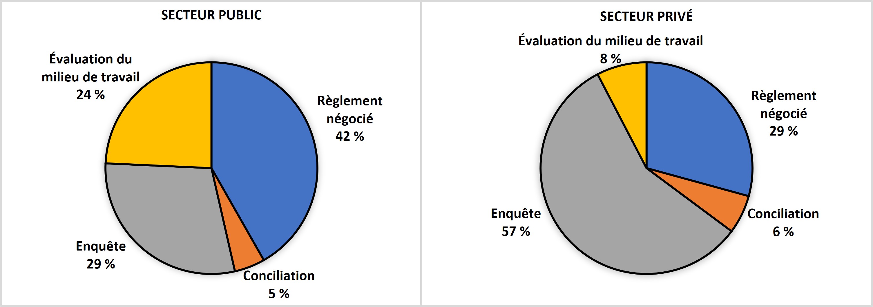 Secteur | Nombre total de règlements | Règlement négocié | Conciliation | Enquête | Évaluation du milieu de travail |