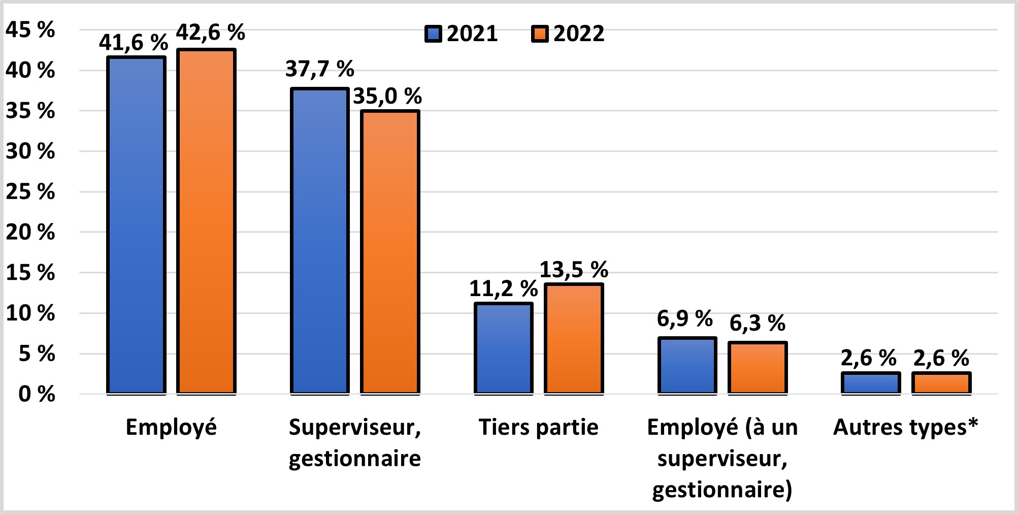 - Parmi les incidents de harcèlement et de violence signalés, le type de rapport établi le plus courant entre la partie principale et la partie intimée est une situation ou un employé ou une employée fait l'objet d'un incident de harcèlement ou de violence de la part d'une ou d'un autre employé (43 % en 2022 et 42 % en 2021).