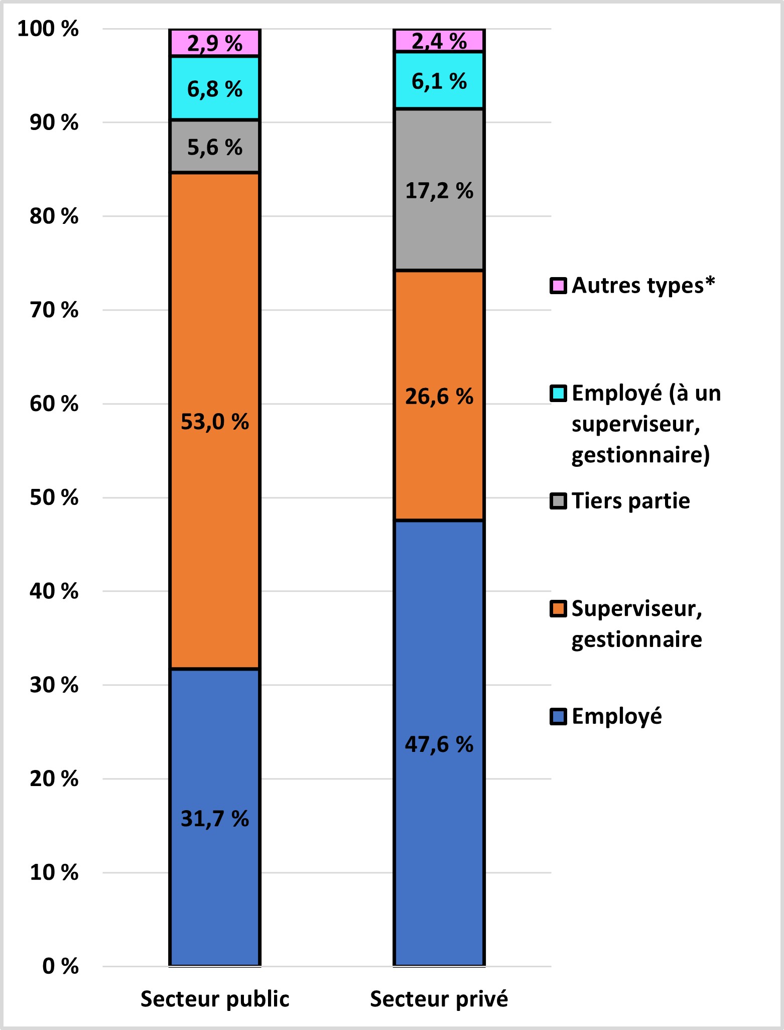 Secteur | Nombre de rapports identifiés | Employé | Superviseur, gestionnaire | Employé (avec un superviseur, un gestionnaire, etc.) | Tiers | Partenaire intime | Autre |