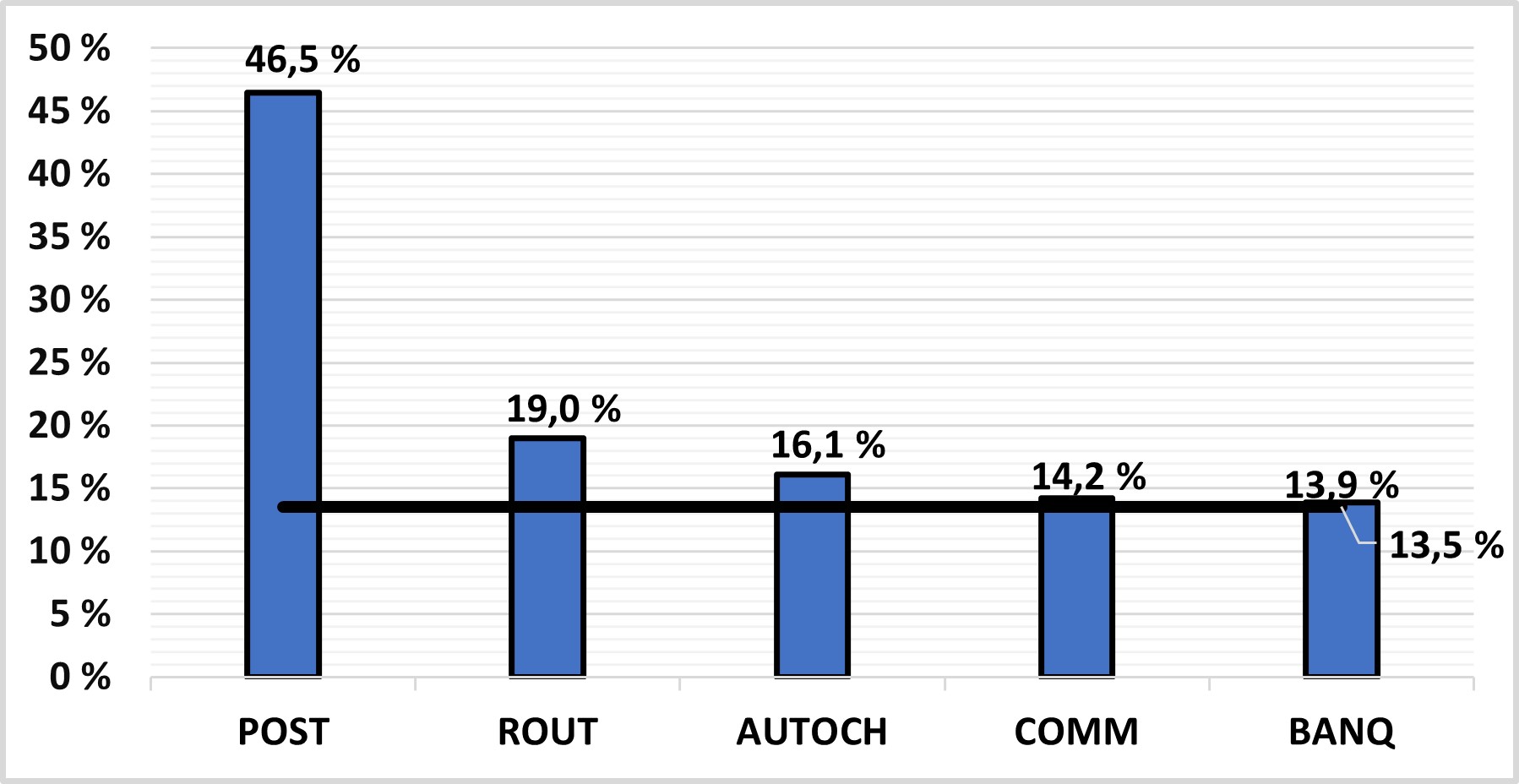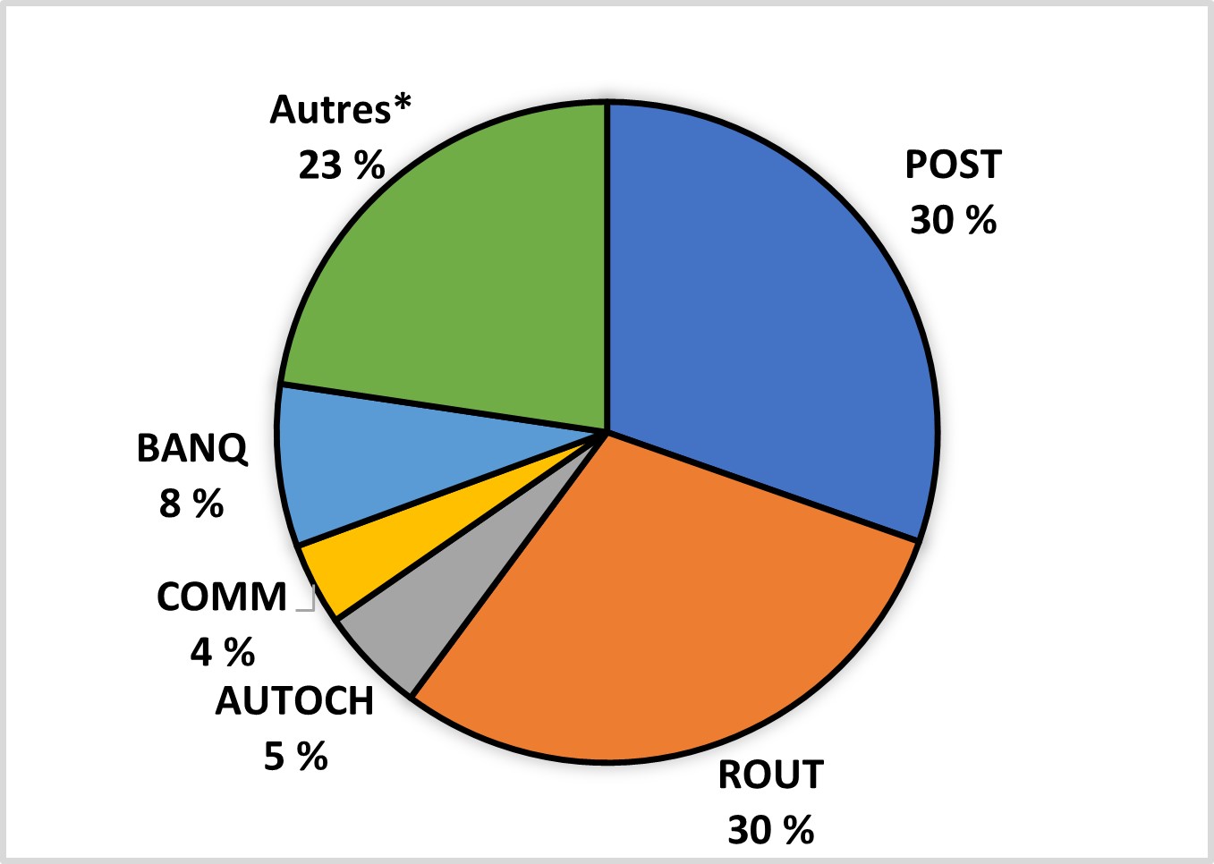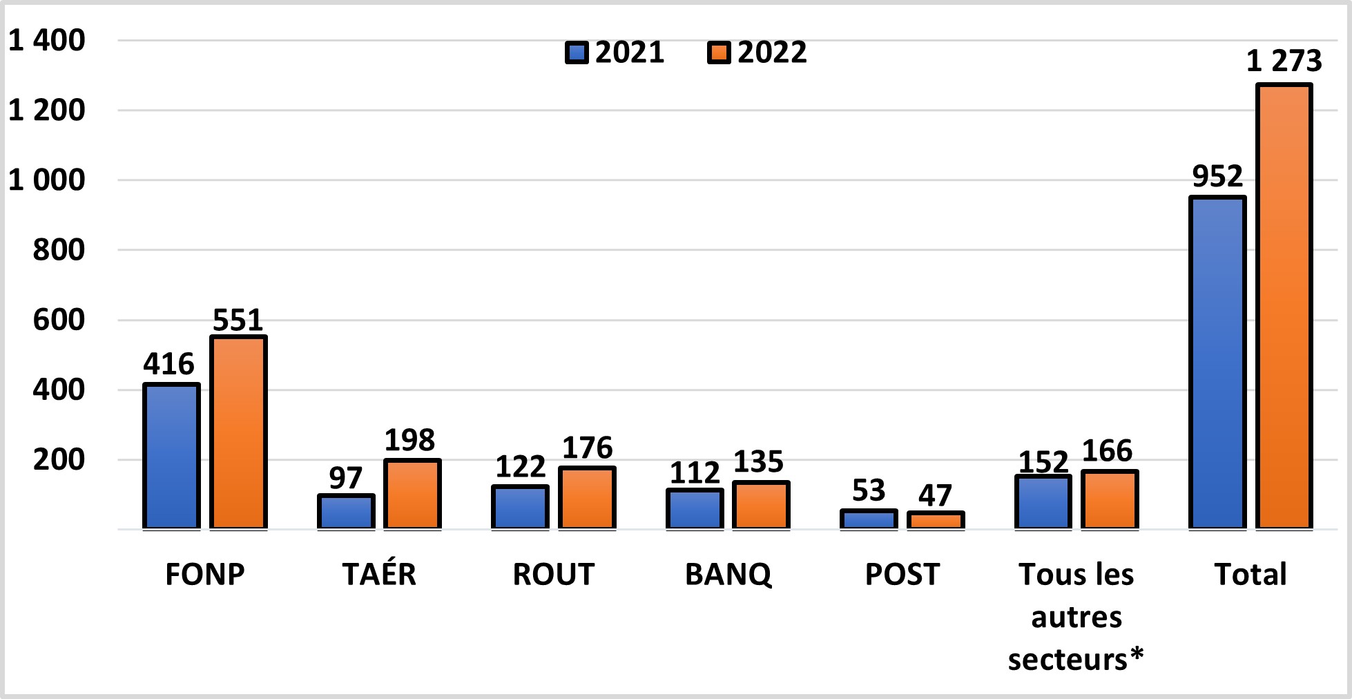 - En 2021 et en 2022, les 5 secteurs suivants, soit les services publics fédéraux, ministères de la fonction publique et sociétés d'État, les services bancaires et les banques, le transport routier, le transport aérien, les services postaux et les entrepreneurs postaux, représentaient environ 80 % de tous les incidents signalés.
