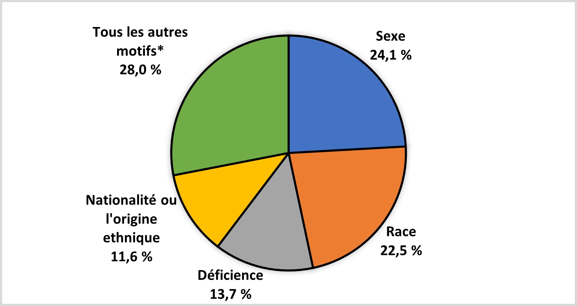 - ** Tous les autres motifs de distinction illicite, à l'exclusion des 4 principaux motifs définis dans la Loi canadienne sur les droits de la personne, sont : 1) l'âge, 2) la couleur, 3) la religion, 4) l'orientation sexuelle, 5) la situation de famille, 6) l'expression ou l'identité de genre, 7) les caractéristiques génétiques, 8) l'état civil, 9) l'état de personne graciée