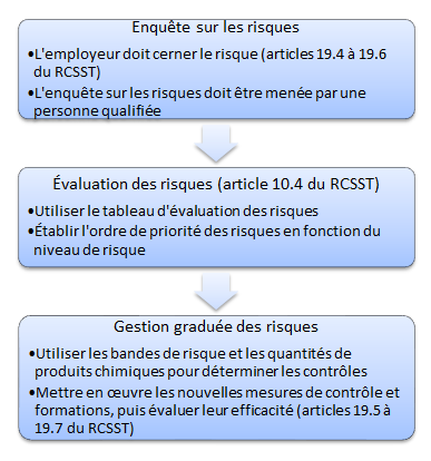 L’employeur a la responsabilité de recenser les dangers chimiques pour la santé des employés et de prendre les précautions appropriées pour contrôler efficacement le danger chimique conformément à la partie X – Substances dangereuses et à la partie XIX – Programme de prévention des risques du Règlement canadien sur la santé et la sécurité au travail (RCSST)Notes de bas de page 17.