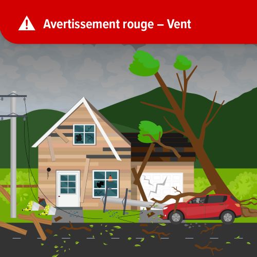 Illustration des répercussions possibles d'un avertissement rouge – de vent. Une maison avec un grand arbre à proximité, une voiture rouge et des poteaux électriques à l'avant. Les lumières de la maison sont éteintes, plusieurs fenêtres sont brisées et le revêtement extérieur est endommagé. Des branches plus petites et des débris importants sont éparpillés. Un poteau électrique et des lignes électriques sont renversés. L'arbre est tombé sur le toit de la maison, causant des dommages considérables. Une autre grosse branche est tombée sur la voiture.
