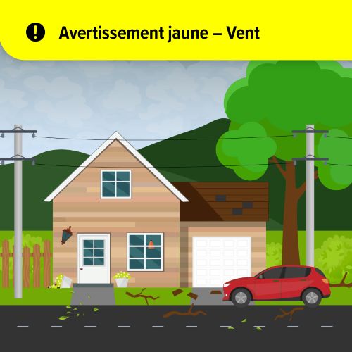 Illustration des répercussions possibles d'un avertissement jaune – de vent. Une maison avec un grand arbre à proximité, une voiture rouge et des poteaux électriques à l'avant. Les lumières de la maison sont éteintes, des branches sont éparpillées devant, une plante en pot est renversée et le toit présente des dommages visibles.