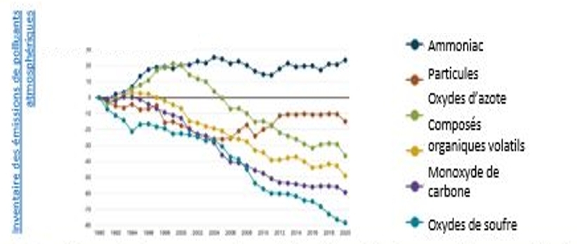 Un graphique sur le pourcentage de variation des émissions de polluants atmosphériques au Canada (1990-2020). Le graphique montre que les émissions de polluants provenant de l’ammoniac ont progressivement augmenté de 1990 à 2020. D’autre part, les émissions de polluants pour les particules fines, les oxydes d’azote, les composés organiques volatils, le monoxyde de carbone et les oxydes de soufre ont régulièrement diminué de 1990 à 2020.