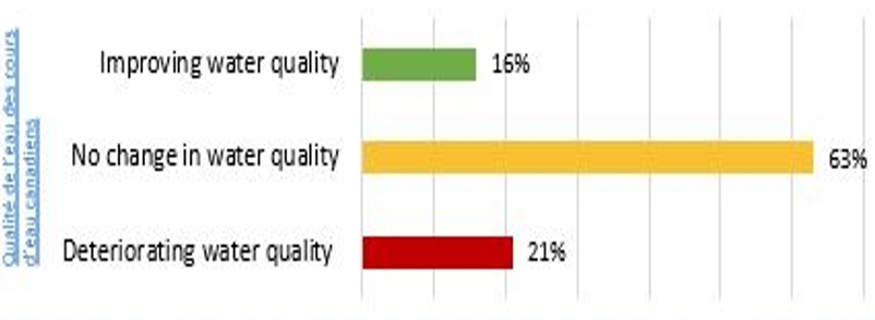 Le graphique à barres montre que 16 % des communautés ont démontré une amélioration de la qualité de l’eau et ont une barre verte indiquant ce pourcentage, 63 % des communautés n’ont démontré aucun changement dans la qualité de l’eau et ont une barre orange indiquant ce pourcentage, et 21 % des communautés ont démontré une détérioration de la qualité de l’eau. La barre rouge indiquant ce pourcentage.