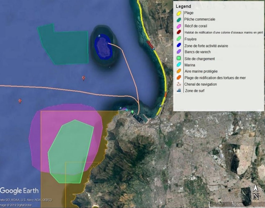 La figure montre une photographie aérienne d’une région côtière typique. La photographie est annotée de plusieurs contraintes géographiques susceptibles de limiter l’emplacement d’un nouveau site d’immersion de déblais de dragage. Les zones de contraintes sur la photographie aérienne comprennent : une plage, une zone de pêche commerciale, un récif de corail, l’habitat de nidification d’une colonie d’oiseaux marins en voie de disparition, une frayère, un point chaud d’activité aviaire, des bancs de varech, un site de chargement de déblais de dragage, une zone de protection marine, un site de ponte de tortues de mer, des canaux d’expédition et une zone de ressac. Les zones de la photographie non identifiées représentent les zones potentielles où le nouveau site d’immersion de déblais de dragage pourrait être situé.