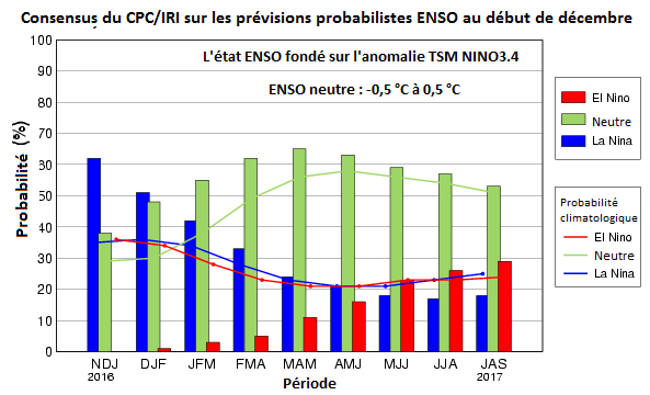 Les graphiques à barres présentent les probabilités à intervalles de trois mois pour chaque élément ENSO (El Niño, conditions neutres et La Niña). Ces éléments sont respectivement en rouge, vert et bleu. Les intervalles vont de la fin de l’automne/du début de l’hiver (novembre 2016 à janvier 2017) jusqu'à l’été (juillet à septembre) 2017.