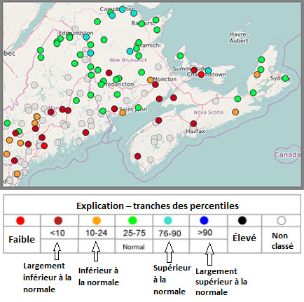 L’écoulement fluvial était largement inférieur à la normale ou inférieur à la normale dans la majeure partie de la région, y compris dans le sud du Maine, dans certaines parties du sud et de l’est du Nouveau-Brunswick, et dans le sud-ouest et le centre de la Nouvelle-Écosse. Le nord du Maine et le nord et le centre du Nouveau-Brunswick ont enregistré un écoulement fluvial supérieur à la normale ou presque normal. L’écoulement fluvial à l’Île-du-Prince-Édouard était varié. L’écoulement fluvial dans l’est de la Nouvelle-Écosse continentale et au Cap-Breton était inférieur à la normale ou normal.