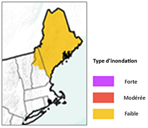 La carte présente le risque qu’il y ait des inondations au cours du printemps. Il y a un risque de faibles inondations dans le nord-est du New Hampshire et l’ensemble du Maine, et peu de risque d’inondations ailleurs en Nouvelle-Angleterre.