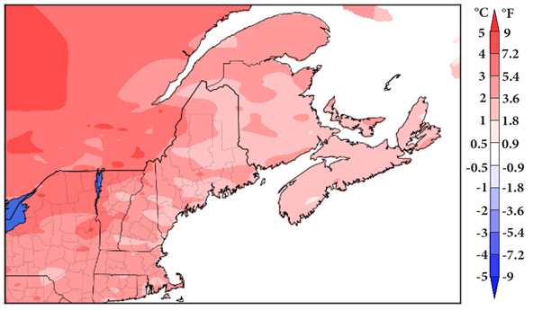 Carte de la région du golfe du Maine illustrant les écarts de température par rapport à la normale calculés sous forme de moyenne pour la période allant de décembre 2016 à février 2017. Les températures ont été supérieures à la normale sur l’ensemble de la région. La majeure partie des Maritimes et de l’est du Maine a généralement connu une moyenne des températures de 1 °C à 2 °C au-dessus de la normale. Le nord du Nouveau-Brunswick et le reste de la Nouvelle-Angleterre ont généralement connu des températures de 2 °C à 3 °C au-dessus de la normale en moyenne.