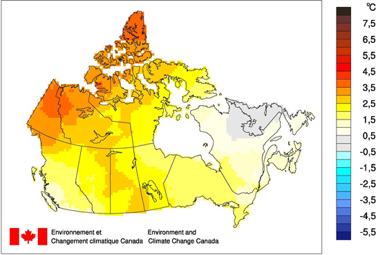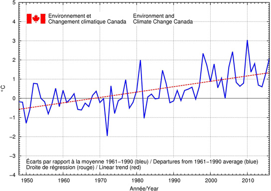 Selon les données préliminaires, la température moyenne nationale en 2016 a été supérieure de 2,1 °C à la moyenne de référence (la moyenne pour la période de référence de 1961 à 1990); il s'agit de la 4e année la plus chaude depuis le début des relevés de températures à l'échelle du pays en 1948. L'année la plus chaude jamais observée est l'année 2010, durant laquelle la température moyenne nationale a dépassé de 3 °C la moyenne de référence. L'année la plus froide a été observée en 1972, alors que la température moyenne nationale était inférieure de 2 °C à la moyenne de référence. La carte des variations de température pour l'année 2016 (ci-dessous) indique que c'est dans la majeure partie du Yukon, le nord des Territoires du Nord-Ouest et le nord-ouest du Nunavut que les températures ont dépassé de plus de 3 °C la moyenne de référence. Des températures de 1 °C au-dessus de la moyenne de référence ont été observées dans le reste du pays, sauf pour une petite région dans le nord-est du Québec et au Labrador où la température était près de la moyenne.