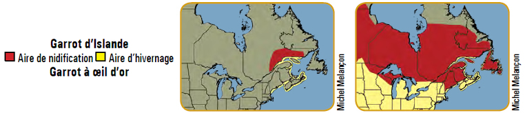 Aires où ces espèces peuvent être observéesType d’aireGarrot d'IslandeGarrot à oeil d'orAire de nidificationEst représentée par une forme triangulaire dont la base se situe le long du fleuve St-Laurent entre Charlevoix et Natashquan ainsi qu’à l’intérieur des terres jusqu’au Réservoir ManicouaganCouvre l’ensemble du territoire québécois et ontarien jusqu’au 56e parallèle Nord ainsi que les provinces de Terre-Neuve-et-Labrador et le Nouveau-BrunswickAire d’hivernageSe situe exclusivement le long des côtes :Sur la Rive-Nord du fleuve St-Laurent de Natashquan à Charlevoix (incluant l’île d’Anticosti)Sur la Rive-Sud du fleuve St-Laurent de Montmagny jusqu’en GaspésieLe long des côtes des provinces des MaritimesUne grande partie de l’aire d’hivernage se situe aux États-Unis. Au Canada, elle se situe le long des côtes du fleuve St-Laurent et des provinces des Maritimes ainsi que sur l’ensemble du territoire de la Nouvelle-Écosse et de l'Île-du-Prince-Édouard