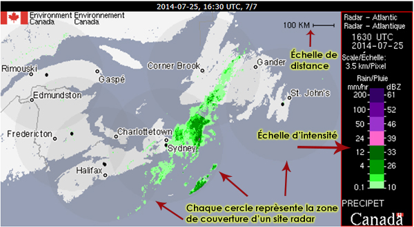L'exemple d'image radar affiche la zone de couverture du radar de Chipman (Nouveau-Brunswick). Chaque cercle est espacé de 40 km. Le cercle rouge correspond à la limite en périphérie de la couverture radar, soit 250 km.