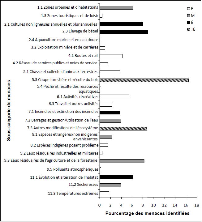 Chaque barre représente le pourcentage du nombre total de menaces définies dans chaque sous-catégorie de menaces dans la RCO 10 (par exemple, si 100 menaces étaient recensées au total pour toutes les espèces prioritaires de la RCO 10 et que 10 d’entre elles étaient de la catégorie 1.1 - Zones urbaines et d’habitation, la barre indiquerait 10 %). Les nuances d’ombrage dans les barres (TÉ = très élevée, É = élevée, M = moyenne et F = faible) représentent l’ampleur globale de toutes les menaces dans chaque sous-catégorie de menaces dans la RCO. Les menaces de la sous-catégorie 5.1, Chasse et collecte d’animaux terrestres,concernent principalement l’intoxication de la sauvagine par ingestion de grenaille de plomb. Les menaces des sous-catégories 6.1, Activités récréatives, et 6.3, Travail et autres activités, concernent les impacts des perturbations anthropiques issues de ces activités. Les menaces de la sous-catégorie 7.3, Autres modifications de l’écosystème, concernent principalement les altérations de la structure forestière dues à l’infestation de dendroctone du pin ponderosa. Les menaces de la sous-catégorie 8.2, Espèces indigènes posant problème, concernent principalement le parasitisme exercé par le Vacher à tête brune. Les menaces de la sous-catégorie 9.3, Eaux résiduaires de l’agriculture et de la foresterie, concernent principalement les effets de l’utilisation des pesticides.