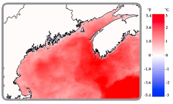 Les anomalies de température chaude à la surface de la mer dans la majeure partie de la région au cours de l'été ont persisté à l'automne, se renforçant et s'étendant pour inclure l'ensemble du golfe du Maine. Ces anomalies de température chaude ont été plus faibles au mois de septembre, mais elles se sont renforcées en octobre et en novembre. Les anomalies de température chaude ont été de plus de 2 °C (3,6 °F) audessus de la moyenne sur 30 ans pour cette période pour la plus grande partie du Sud du plateau néo-écossais et les bassins plus profonds du golfe du Maine. Dans la baie de Fundy et dans la zone côtière du golfe du Maine, on a constaté des anomalies de température chaude de plus de 1 °C (1,8 °F). Les anomalies de température chaude les plus faibles, de 0,5 °C (0,9 °F) environ, se situaient sur le banc de Georges.