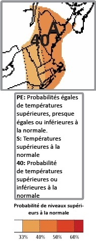 Pour juillet et août, Environnement Canada indique une probabilité accrue de températures supérieures à la normale pour la Nouvelle-Écosse et des probabilités égales ailleurs (graphique ci-dessus). De juin à août, le Climate Prediction Center du National Oceanic and Atmospheric Administration prévoit une probabilité accrue de températures supérieures à la normale pour le Maine, le New Hampshire et le Massachusetts (graphique cidessous).