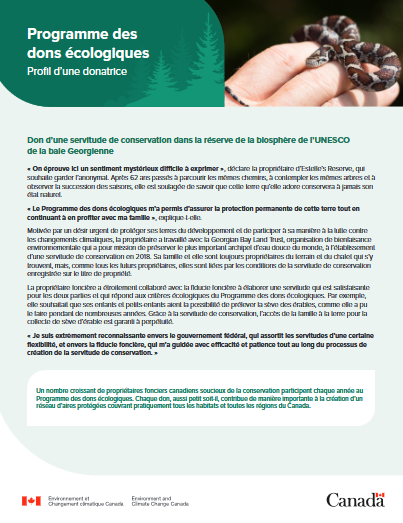 Grâce au Programme des dons écologiques du gouvernement du Canada, les propriétaires fonciers peuvent faire don de leurs terres ou d’un intérêt foncier partiel (par exemple, une servitude de conservation) à un organisme bénéficiaire admissible qui la protégera à perpétuité, comme une fiducie foncière, un organisme de conservation ou un gouvernement. Outre la tranquillité d’esprit que procure la protection à perpétuité des terres, les donateurs peuvent bénéficier d’avantages fiscaux importants, notamment l’élimination de l’impôt sur les gains en capital.