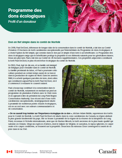 En 2019, Paul DeCloet, défenseur de longue date de la conservation dans le comté de Norfolk, a fait don au Comté d’environ 23 hectares de forêt carolinienne exceptionnelle par l’intermédiaire du Programme de dons écologiques. Il a choisi l’option du fief simple, qui consiste dans le don pur et simple d’une terre à un bénéficiaire. Le Programme des dons écologiques exige que le bénéficiaire protège la propriété et ses éléments naturels pour les générations futures. Deux ans plus tard, Paul a fait don au Comté de 26 hectares supplémentaires. Ces propriétés adjacentes constituent la forêt Paul DeCloet, le plus récent trésor écologique du comté de Norfolk.
