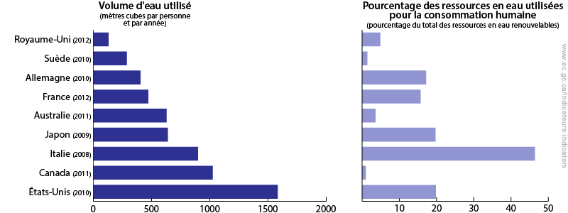 Le graphique à barres sur la droite montre le pourcentage des ressources en eau renouvelables utilisées par un pays par rapport au total de ses ressources en eau renouvelables. L'Italie est le pays qui utilise le volume d'eau le plus important par rapport à ses ressources en eau renouvelables (46,4 %), et le Canada celui qui utilise le plus faible volume (1,0 %).