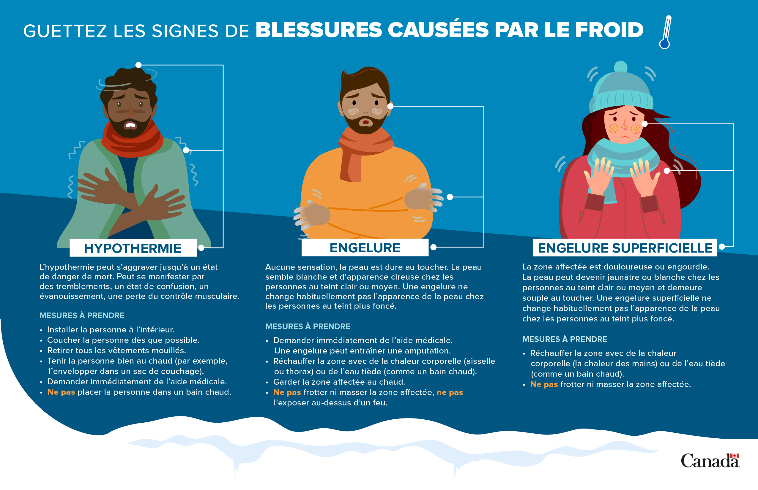 Guettez les signes de blessures causées par le froid. Format haute définition (551x1651, 1.5 MB)