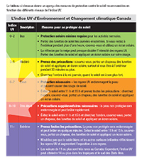 Les documents expliquent l'indice UV au Canada. On peut y lire des conseils sur la sécurité au soleil et y consulter un tableau proposant des mesures de précaution différentes selon la valeur de l'indice UV.