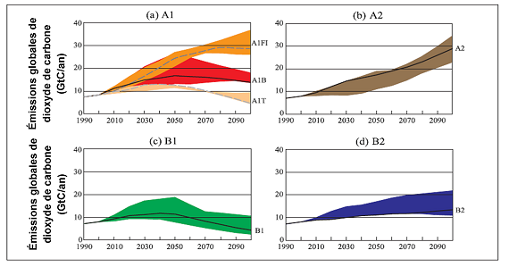 Le Groupe d’experts intergouvernemental sur l’évolution du climat (GIEC) a été établi par les Nations Unies et l’Organisation météorologique mondiale à titre d’organisme scientifique pour examiner et évaluer les renseignements scientifiques et socioéconomiques sur les risques associés aux changements climatiques. Depuis 1990, le Groupe a publié une évaluation mise à jour environ tous les cinq ans, la plus récente (quatrième rapport d’évaluation) ayant été publiée en 2007. En vue de la préparation du troisième rapport d’évaluation en 2001, un comité du Groupe d’experts intergouvernemental sur l’évolution du climat a préparé un Rapport spécial sur les scénarios d’émissions pour orienter la réalisation d’études relatives aux changements climatiques (Nakicenovic et al., 2000). Les scénarios de ce rapport offrent des estimations des futures émissions de gaz à effet de serre selon différentes hypothèses concernant la croissance de la population, le développement économique, la technologie et les changements relatifs à l’utilisation des terres. Le Rapport compte actuellement 40 différents scénarios, lesquels sont regroupés en quatre familles générales de scénarios appelées A1, A2, B1 et B2. Chaque famille de scénarios est représentée par une prévision sur un siècle des émissions mondiales de gaz à effet de serre, comme l’illustre la Figure 13.1.