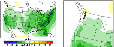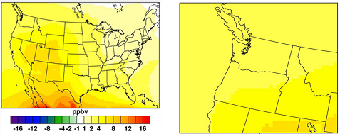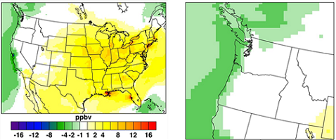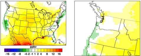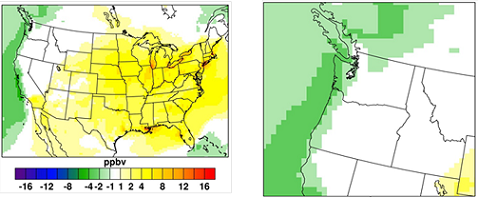 Les simulations du modèle réalisées en utilisant le système de modélisation CMAQ avec des variations du scénario d’émissions A1B du Rapport spécial sur les scénarios d’émissions ont servi à prévoir les futurs niveaux de pollution atmosphérique pour les conditions du changement planétaire durant la décennie centrée sur l’an 2050. Les résultats ont démontré que les effets généraux des changements planétaires produiront des augmentations de l’ozone à l’échelle des États-Unis, avec des augmentations plus modestes dans la région du nord-ouest du Pacifique. Ces changements sont attribuables aux effets du climat, y compris aux émissions biosynthétiques accrues de composés organiques volatils et d’oxyde d’azote, et à des augmentations de concentrations de fond d’ozone et de ses précurseurs à l’échelle mondiale. Les effets du climat (la météorologie à proprement parler) montrent une diminution nette des concentrations maximales d’ozone dans l’ouest des États-Unis, mais l’inclusion des effets des émissions biosynthétiques accrues provoque une légère augmentation des valeurs maximales d’ozone. Des augmentations plus importantes sont prévues pour d’autres parties des États-Unis étant donné les températures plus élevées et les effets connexes sur les réactions atmosphériques et les émissions biosynthétiques. Les effets du climat et le transport à grande distance doivent être pris en compte pour toute décision future sur la gestion de la qualité de l’air qui sera liée à l’ozone dans la région.