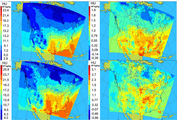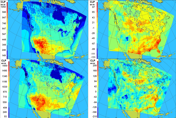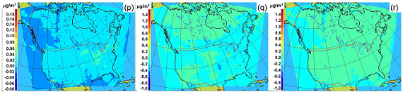 Le troisième diagramme montre les contributions de dépôts humides de N03¬. Dans ce cas, on observe des diminutions de l'ordre de -50 à -300 tonnes/été pour la moitié est des États-Unis, du Missouri à la Géorgie, et au nord jusqu'à la frontière canadienne. On observe également des diminutions de cette ampleur en Floride, à San Diego, en Nouvelle-Orléans, à Houston, au sud de l'Alberta, et dans la région de la vallée du bas Fraser-Puget Sound. Pour le reste de la moitié est des États-Unis, il y a des diminutions entre -30 et -80 tonnes/été. Dans le reste du continent, les changements sont de l'ordre de -10 à 10 tonnes/été.