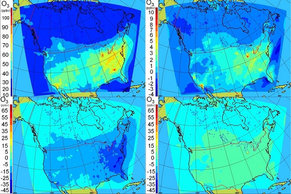 Dans le diagramme A, on voit la moyenne sur dix ans (climat actuel, émissions actuelles) du total de dépôts moyens estivaux d'ozone dans la couche la plus basse du modèle. L'échelle va de 0 à 2 200 tonnes/été. Au Canada, les dépôts varient de 0 à 1 000 tonnes/été; les niveaux les plus élevés se trouvent le long de la frontière américaine, et les niveaux plus bas, au nord. Les dépôts les plus élevés se trouvent dans le sud de l'Ontario (de 1 000 à 1 600 tonnes/été). La côte ouest des États-Unis a des dépôts de l'ordre de 1 000 à 1 600 tonnes/été; des niveaux un peu moins élevés, entre 200 et 1 000 tonnes/été, sont observés dans les régions intérieures de l'ouest. À l'est, les niveaux les plus élevés (de 1 600 à 2 200 tonnes/été) sont observés entre Indiana et Chesapeake, et aussi loin au nord que le lac Ontario. Lorsqu'on s'éloigne de cette région, les dépôts diminuent selon une tendance de cible, à des niveaux de 800 à 1 000 tonnes/été au centre des États-Unis.