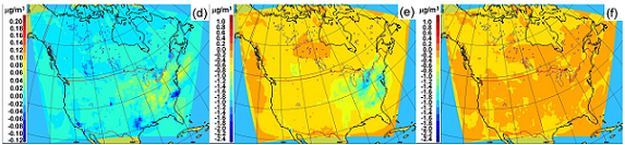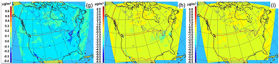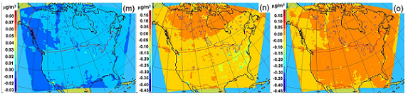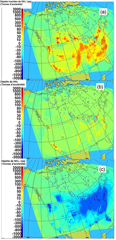 Le deuxième diagramme montre les contributions de dépôts secs de NH3 gazeux. Les changements dans ce cas sont moins importants : des changements dans la fourchette de -10 à 10 tonnes/été sont observés dans la majorité du continent. Des petites régions avec des augmentations entre 50 et 500 tonnes/été sont observées dans les villes suivantes : Vancouver, Calgary, Edmonton, Regina, Saskatoon, Winnipeg, Toronto, Montréal et Détroit. Il y a également des régions avec des augmentations semblables au sud de l'Idaho, et de façon sporadique le long de la côte est et dans des régions intérieures à l'est des États-Unis. Une région un peu plus importante est observée au centre de la Californie.